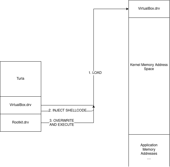 TDL acts as a fully functional driver loader that can be used independently of the Windows loader. As a byproduct it defeats 64-bit driver signature enforcement as well. The magic of Turla is the offensive technique it uses to get a custom driver to load into kernel memory. It comes packaged with a vulnerable version of a VirtualBox kernel mode driver, it loads and exploits this driver to overwrite kernel memory with a custom crafted driver before jumping to the DriverEntry function to begin execution. Effectively this can be visualised as so: