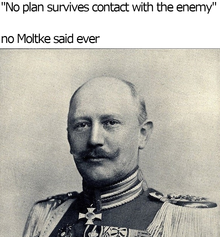 Helmuth von Moltke has been consistently misquoted over the years. He didn’t say “no plan survives contact with the enemy” (principle 1.5, never trust a quote!). He said (translated from German) “…no plan of operations reaches with any certainty beyond the first encounter with the enemy’s main force…” (Großer Generalstab, 1883). Moltke believed that plans rarely go smoothly and that having multiple strategies in place is important. He was a meticulous planner who emphasised the importance of practice and learning how to react to different situations. So it is time we all stopped using him as an excuse to avoid proper planning!