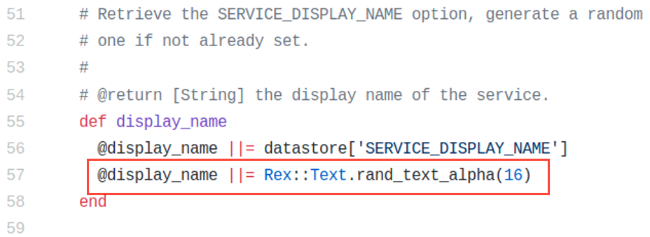Focusing more on the name of the service being installed (yReAMNiNjOyqeWQI) looks like gibberish which is exactly what it is. Looking at the source code of the psexec module for Metasploit framework, we see that the display name is essentially 16 character long random text! We just found another possible filter that could help us detect these types of exploits.