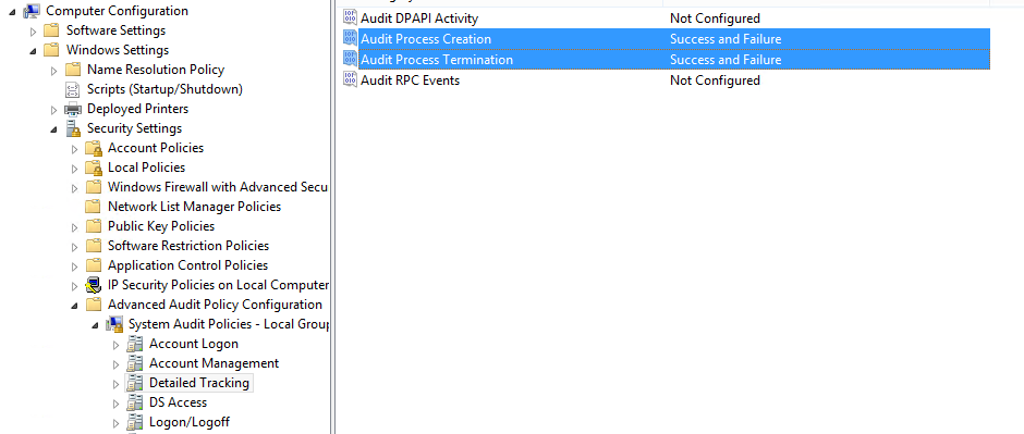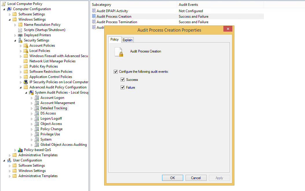 - Follow the path Policies → Windows Settings → Security Settings → Advanced Audit Policy Configuration → Audit Policies → System Audit Policies → Detailed Tracking. And enable both Successful and Failure configuration for “Audit Process Creation” and “Audit Process Termination” as shown below.