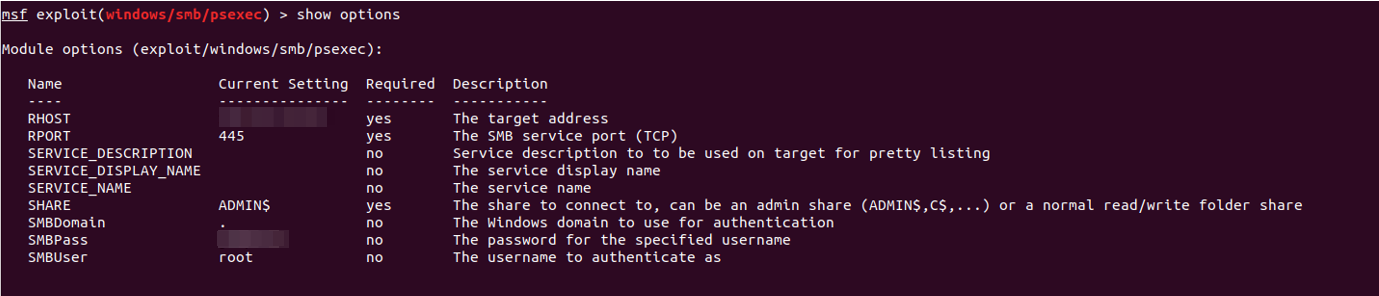 Now, we can move forward and test this with the psexec module from Metasploit using the exploit/windows/smb/psexec module as shown below.