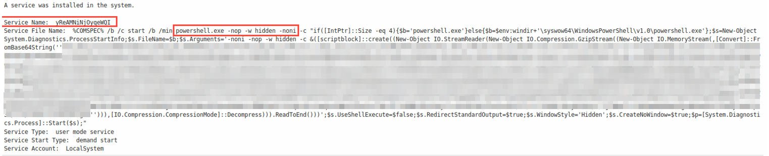 The details around this event shows that the service named yReAMNiNjOyqeWQI was installed by the user root (which we know is the user used for this exploit). There are some interesting parameters defined here such as -nop, -hidden and -noni