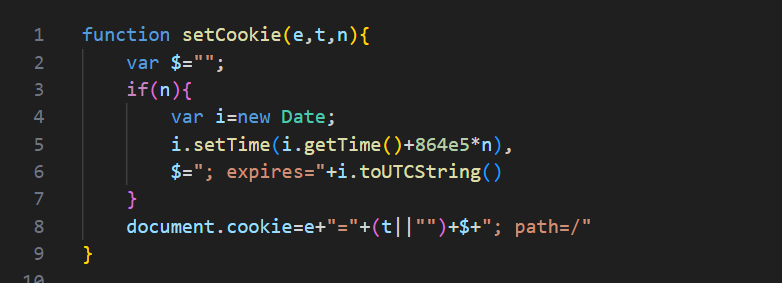 The ‘setCookie(e, t, n)’ function is used to create or update a cookie with a specified name, value, and an optional expiration time. The e parameter represents the name of the cookie, and ‘t’ is the value to store in the cookie. If it is empty, the cookie value will be set to an empty string. The ‘n’ parameter specifies the number of days until the cookie expires. If ‘n’ is null, the cookie becomes a session cookie, meaning it will expire when the browser is closed. The cookie is set in the format ‘[name]=[value]; expires=[date]; path=/’, where ‘path=/’ ensures the cookie is accessible across all pages on the domain.