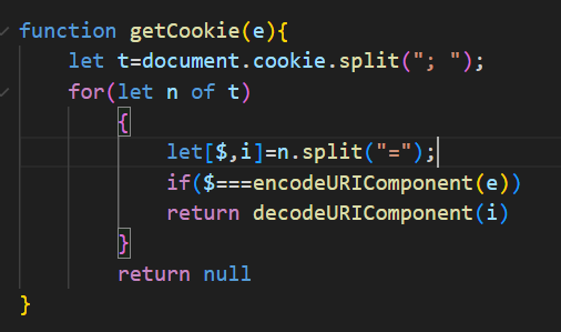 ‘getCookie(e)’ function retrieves the value of a specific cookie by its name. It searches through all available cookies, decodes the value and returns it if found.