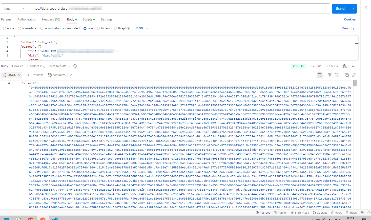 I also made a request to the BSC smart contract, and from the “result” field in the response, we can see that the first 32 bytes after 0x represent an offset pointer, and the next 32 bytes represent the length of the payload.