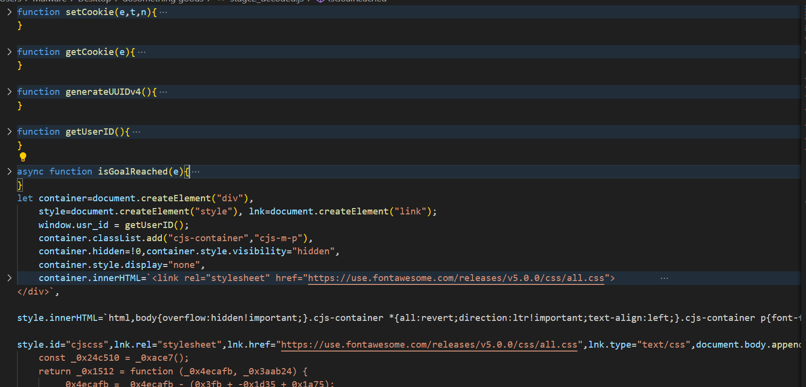 I attempted to decode the Base64-encoded blob, but unfortunately, the codes appear to be heavily obfuscated JavaScript. The most important parts are the asynchronous function, as shown in Figure 5.