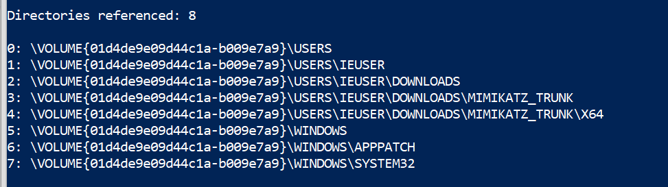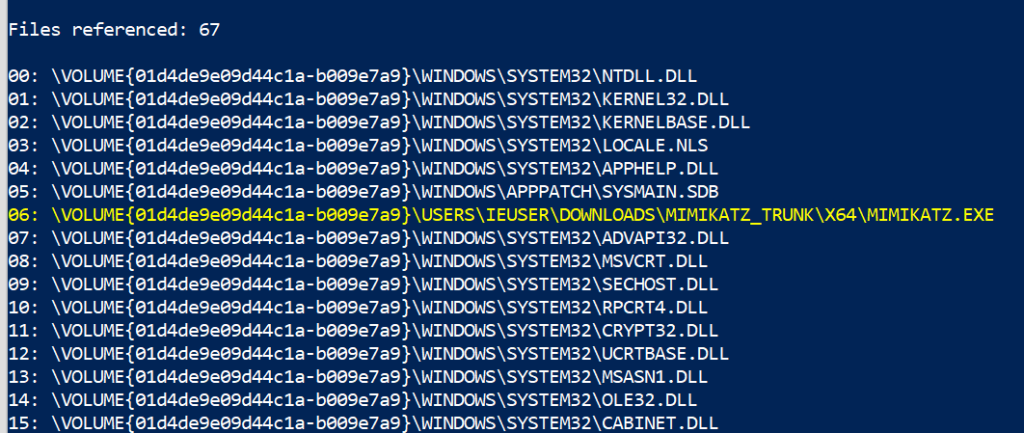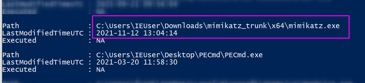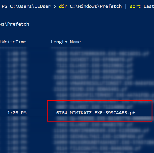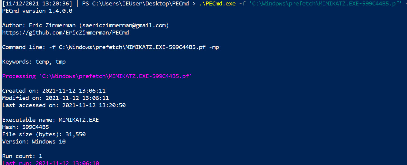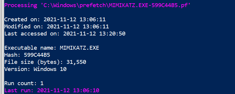 .\PECmd .exe -f 'C:\Windows\prefetch\MIMIKATZ.EXE-599C44B5.pf'