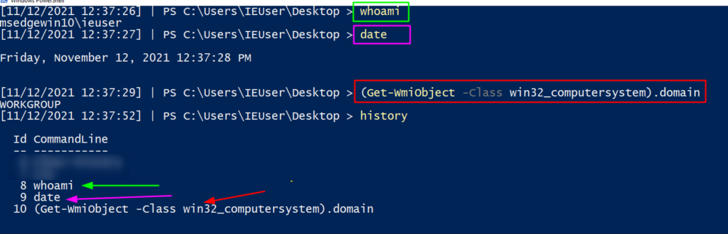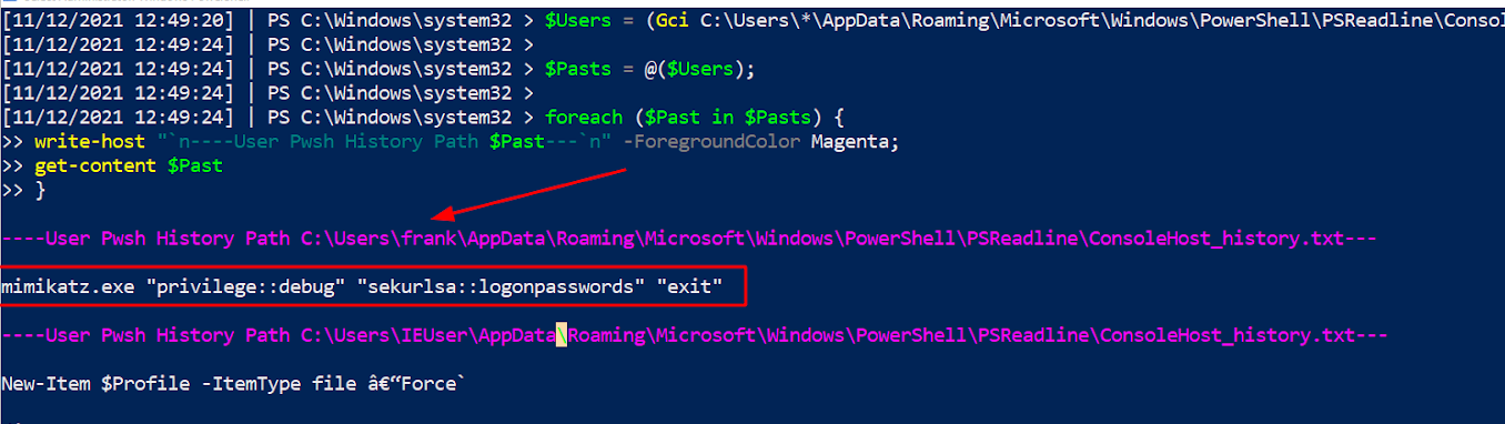 From our short script, in the pink text we’ve printed the users’ Console History file. This will snitch on last four thousand commands from each user account. We can also see that in the red arrow and box Frank’s account is highlighted for deploying Mimikatz! Below Frank’s commands, we can see the IEUser’s PowerShell history begins to also be printed.