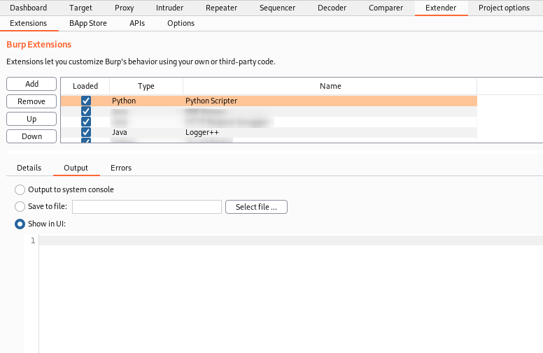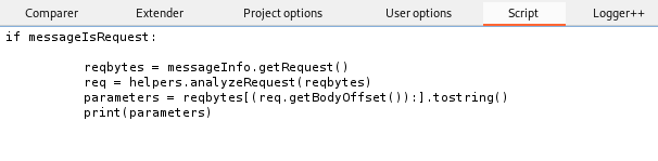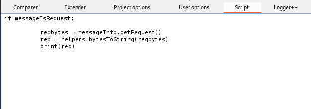 Along with installing the extension, I recommend installing the logger++ extension [3] as this is useful for viewing the request after it has been modified by the python script. Overall, the basic setup involves three areas:
