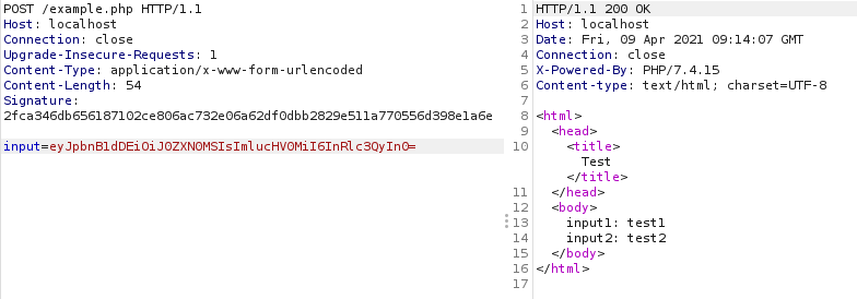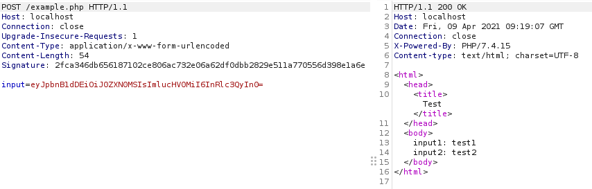 As an example, I’ve created a very basic PHP web app that simply takes a base64 JSON encoded string containing two user input values and reflects those inputs in the web response. The application also requires a “Signature” header to be sent which contains a SHA256 hash of the length of the body of the POST request. This application is obviously vulnerable to reflected cross-site scripting, but if we try to use Burp’s active scanner to identify this it will fail. This happens as the request signature isn’t updated when fuzzing with XSS payloads, so Burp won’t detect the payloads in the response.