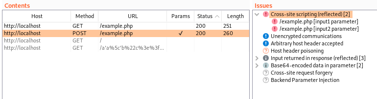 Now if we active scan the request the scanner will instantly pick up cross-site scripting vulnerabilities.