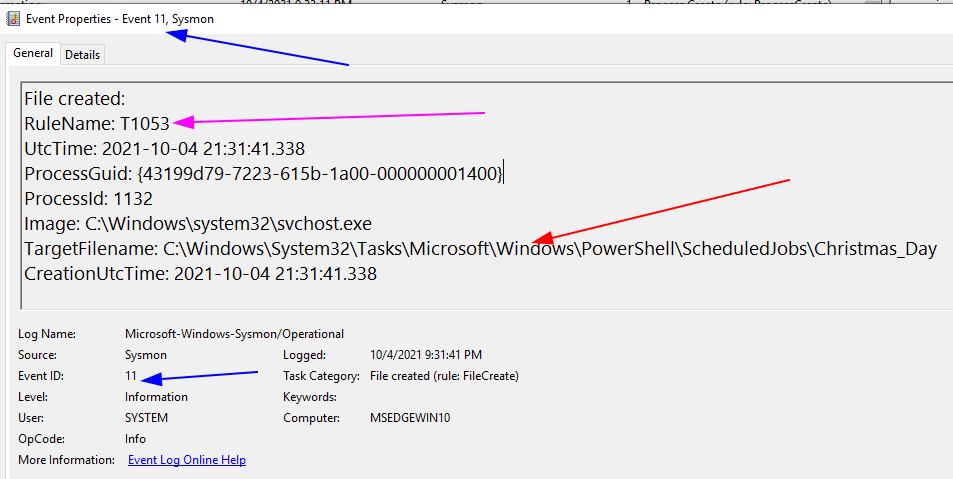 In the above sysmon/endpoint log based SIEM, we would have some visibility of scheduled jobs. However this data won’t be enough for an analyst to work with. We need to dig deeper beyond passive monitoring to active threat hunting to identify exactly what this scheduled job is about.