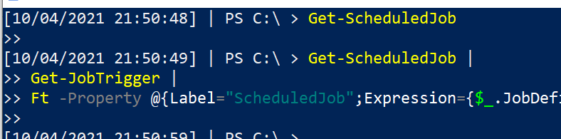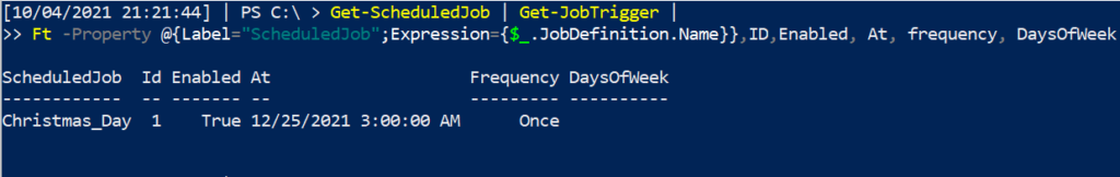 Ft -Property @{Label="ScheduledJob";Expression={$_.JobDefinition.Name}},ID,Enabled, At, frequency, DaysOfWeek