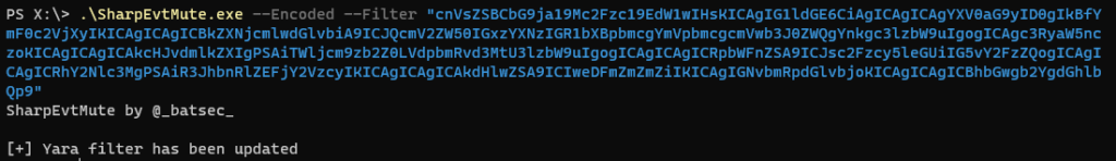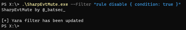 .\\SharpEvtMute.exe --Filter "rule disable { condition: true }"