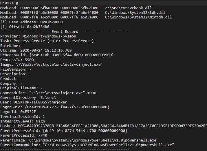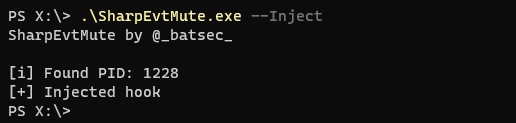 It’s PID can be found by running SharpEvtMute.exe --Pid. The hook can be placed by manually injecting the shellcode (run make in EvtMuteBin) via your C2 framework of choice, e.g shinject in shad0w.