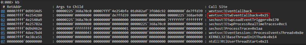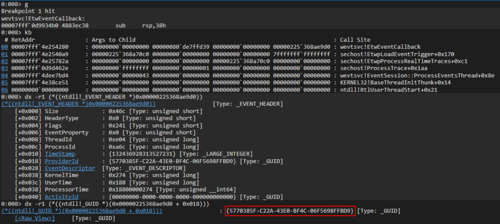 The EVENT_HEADER structure will contain more info about the event including the provider which is reporting the event. With a little windbg magic we are able to grab this providers GUID.