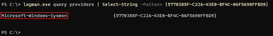 Now that we have the providers GUID we can look it up using the logman.exe utility, and see that the provider was Microsoft-Windows-Sysmon.