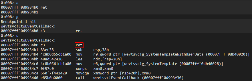 Now we know we are looking in the right place we can patch this function with a ret instruction. This will stop all the events from being reported.
