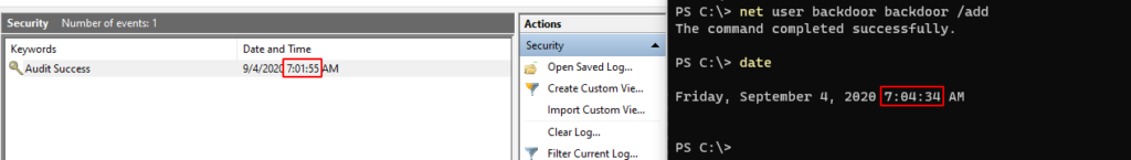 Below you can see that I cleared the event log at 7:01 then added a new user at 7:04 but this event was not reported because of our ret in the callback is causing all events system wide to be dropped.